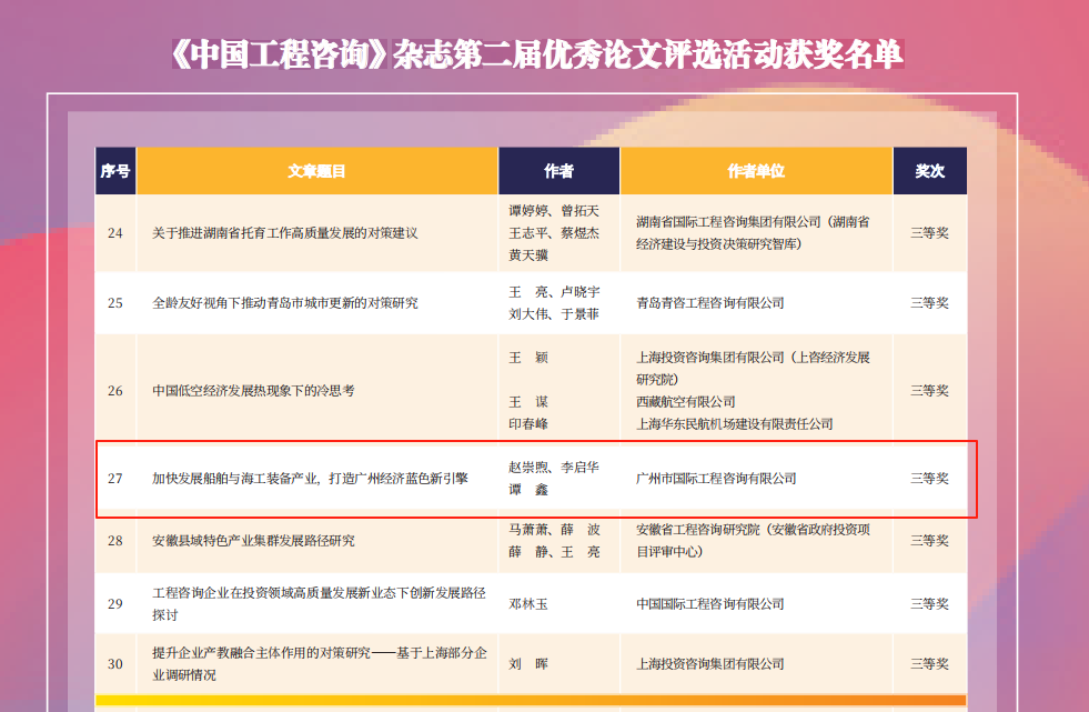 廣州國際咨詢公司榮獲《中國工程咨詢》雜志第二屆優(yōu)秀論文獎